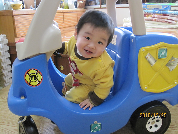 一進門..馬上坐上他的車子, 然後望著我 =>因為腳太短踩不到地,車子動不了