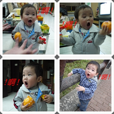 - 會說"啊" : 現在學習能力很強.看一次他就會馬上現學現賣. 而且還會不厭其煩的一直重複. 喜歡故意把東西弄不好. 然後"手一攤"+配上嘴巴"啊"一聲 . 我只能說把大家逗的哈哈笑