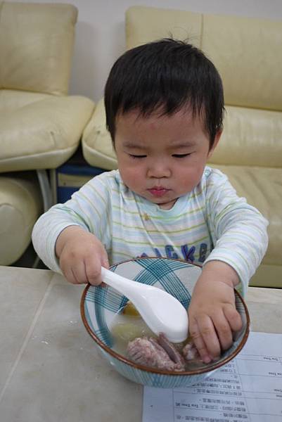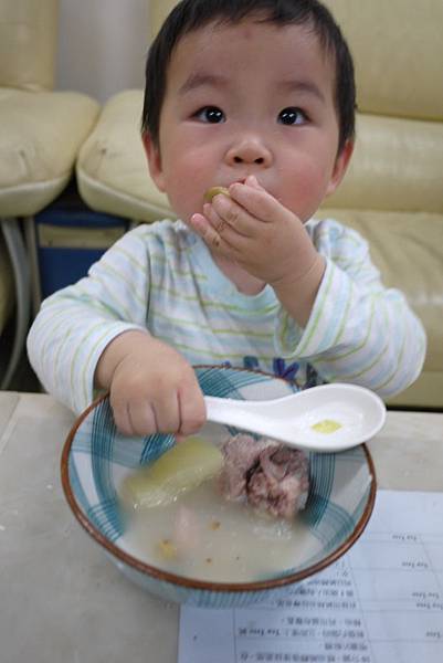 津津有味吃著大人的飯, 順便偷偷參雜一點粥, 不知不覺竟也吃了快半碗. 阿鴻望著桌上那碗冬瓜湯, 硬是想要自己動手抓裡面的冬瓜往嘴巴塞. 心想, 好吧! 反正等等就要洗澡, 就讓你弄個髒吧............