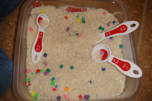 舉例: 有一樣不用花錢的遊戲, 就是玩米....讓小朋友從手指間感受不同物品以外. 也能藉此訓練他們那小小的手指肌肉群. 這項遊戲要老人不在家時才能玩, 因為米是拿來吃不是拿來玩, 媽媽的心臟要很強壯, 玩完後會一片混亂