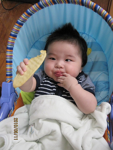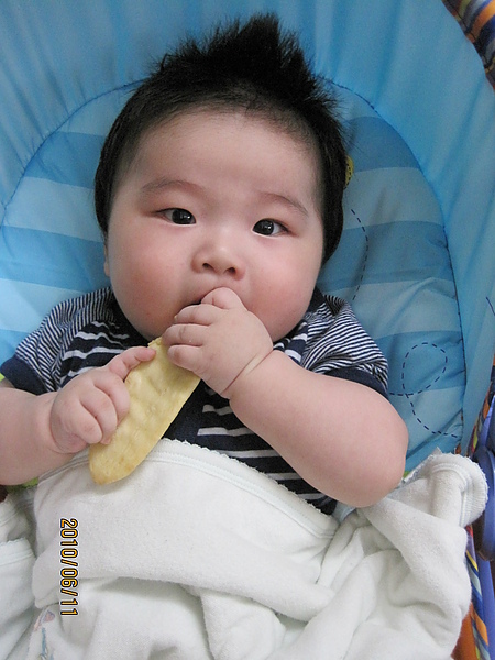 鴻鴻 5個多月時我就很想讓他嘗試吃副食品, 因為其實很多人說4個月就可以開始吃副食品, 市面上也有一些副食品上面標示4-6M.........所以我就很無聊的買了包旺旺出品的雞肉口味牙餅!! 反正就好玩, 最近也都一直在吃手指, 吃餅訓練一下也不錯, 總比啃手指好吧!!